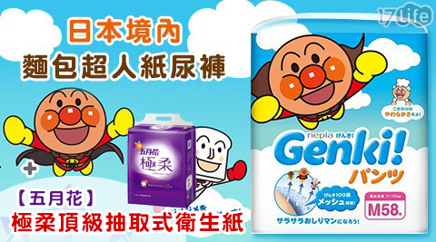 只要1,499元(含運)即可享有原價2,500元日本原裝進口境內麵包超人紙尿褲(褲型)1箱+【五月花】極柔頂級抽取式衛生紙1串(8包/串),紙尿褲多尺寸任選。